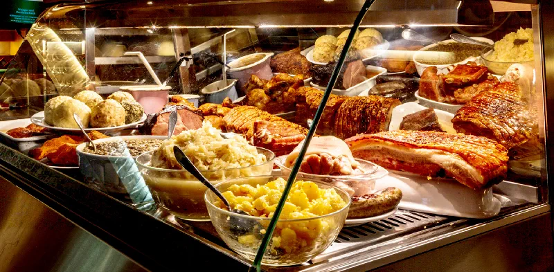 Ein gemütliches Restaurant-Interieur im Weinviertel-Charme mit Holzmöbeln und Regalen, einer Vitrine voller Speisen und warmer Beleuchtung. Tische und Stühle stehen auf einem gefliesten Boden und vermitteln die einladende Atmosphäre des Heurigen GILG.